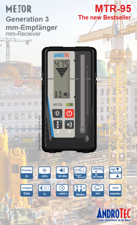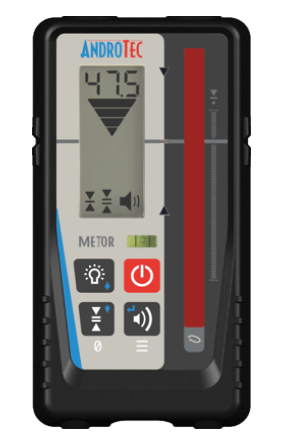 Odbiornik Androtec MTR-95R to niemiecki urządzenie wysokiej klasy oraz dokładności. Odbiornik posiada odczyt cyfrowy a sama detekcja wiązki odbywa się z dokładnością wynoszącą 0.5mm! W razie wykonywania mniej precyzyjnych prac istnieje opcja wyboru trybu z pośród: 0.5 mm, 1.0 mm, 2.0 mm, 5.0 mm, 10.0 mm. Detektor dzięki swojej konstrukcji odporny jest na zakłócenia powodowane silnym słońcem, lampami błyskowymi, lampami LED czy świetlówkami. Androtec wyposażył MTR 95R w dwa ekrany LCD aby łatwo było wykonać odczyt w każdych warunkach, dodatkowo urządzenie posiada bardzo intensywne diody LED pozwalające już z daleka lub o zmierzchu na wstępną ocenę pomiaru. Solidnie wykonana obudowa pokryta została gumą chroniącą delikatną elektronikę urządzenia - potwierdza to wysokie IP67 (wodoodporność). Góra urządzenia posiada 2 magnesy neodymowe pozwalające mocować bezpiecznie detektor na profilach metalowych. Odbiornik na jednej baterii AA zapewnia czas pracy do 45 godzin.