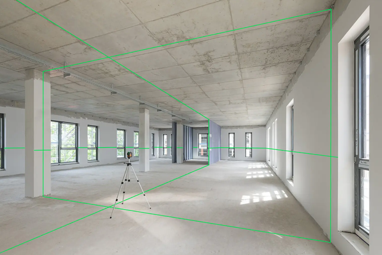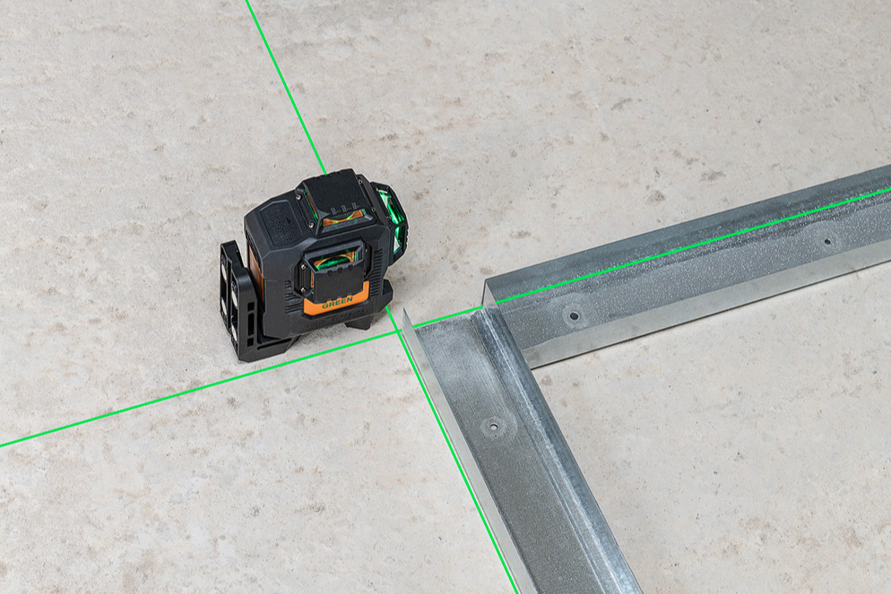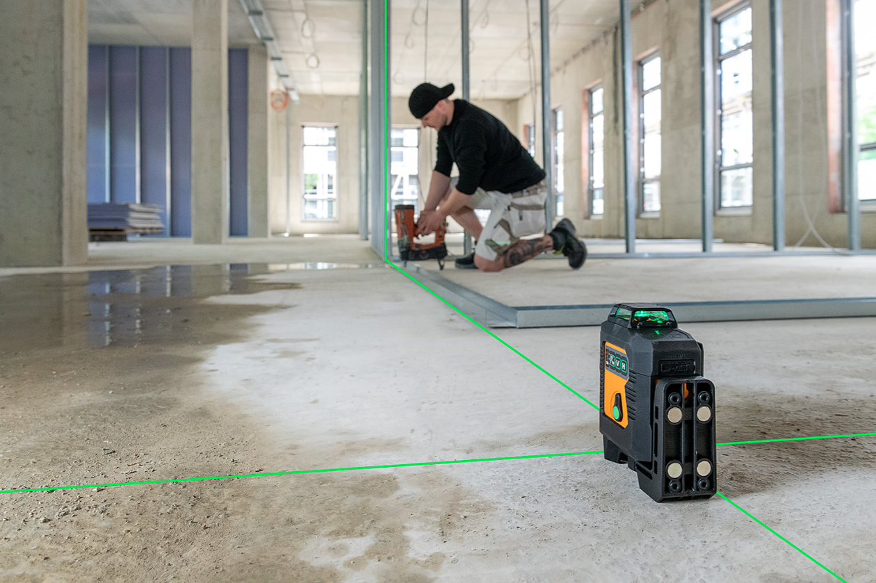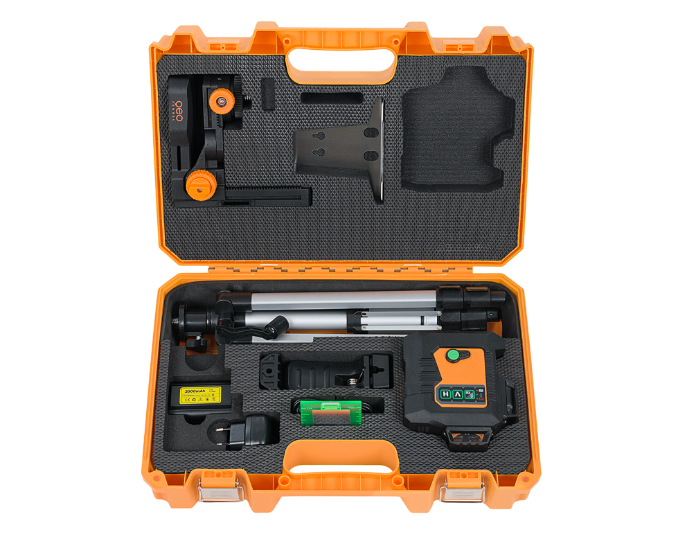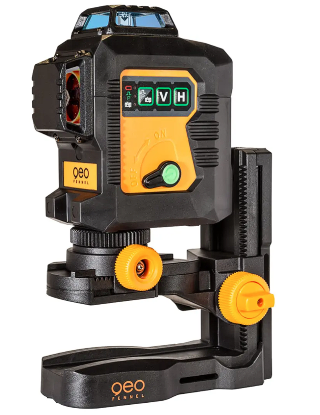Profesjonalny laser krzyżowy płaszczyznowy marki geo-FENNEL emitujący mocne i dokładne zielone linie laserowe 3x360 stopni o zasięgu 150m.Komplet