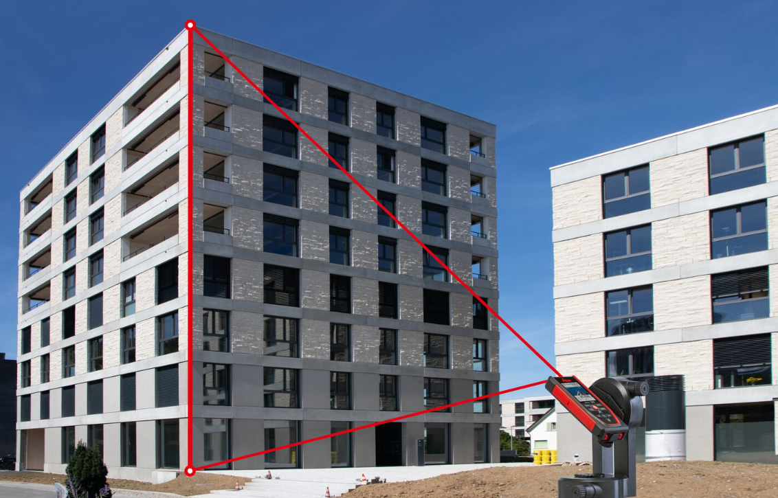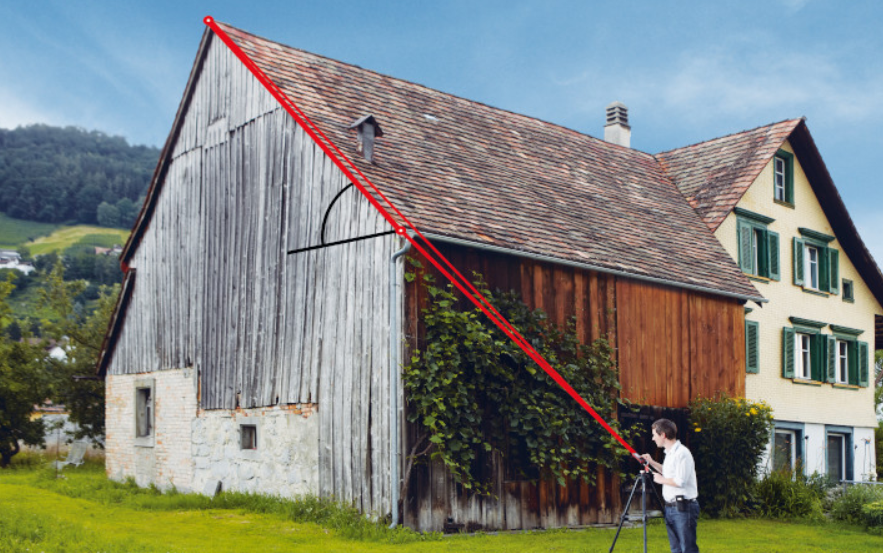 Czujnik umożliwia również pomiary elementów skośnych oraz profili terenowych. Pierwsza funkcja przydatna jest szczególnie podczas pomiarów dachów, paneli słonecznych itp. Dalmierz określa nie tylko długość mierzonego odcinka, ale również nachylenie badanego elementu.