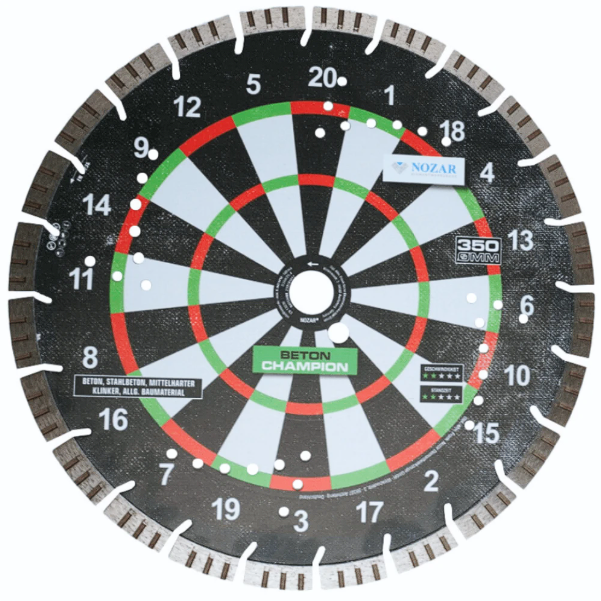 Tarcza diamentowa Nozar Beton Champion 350 mm marki Nozar to profesjonalne narzędzie do precyzyjnego cięcia kostki brukowej, krawężników oraz galanterii betonowej. W zestawie DART znajdują się 3 tarcze diamentowe o średnicy 350 mm i otworze 25,4 mm, co zapewnia długą żywotność i wydajność pracy.Limitowana edycja tarcz to wyjątkowa propozycja dla profesjonalistów, którzy cenią sobie jakość i funkcjonalność.Przy zakupie 3szt tarcz otrzymujesz dodatkowo 6 sztuk kolorowych lotek do gry w darty, które dodają unikalności temu produktowi.